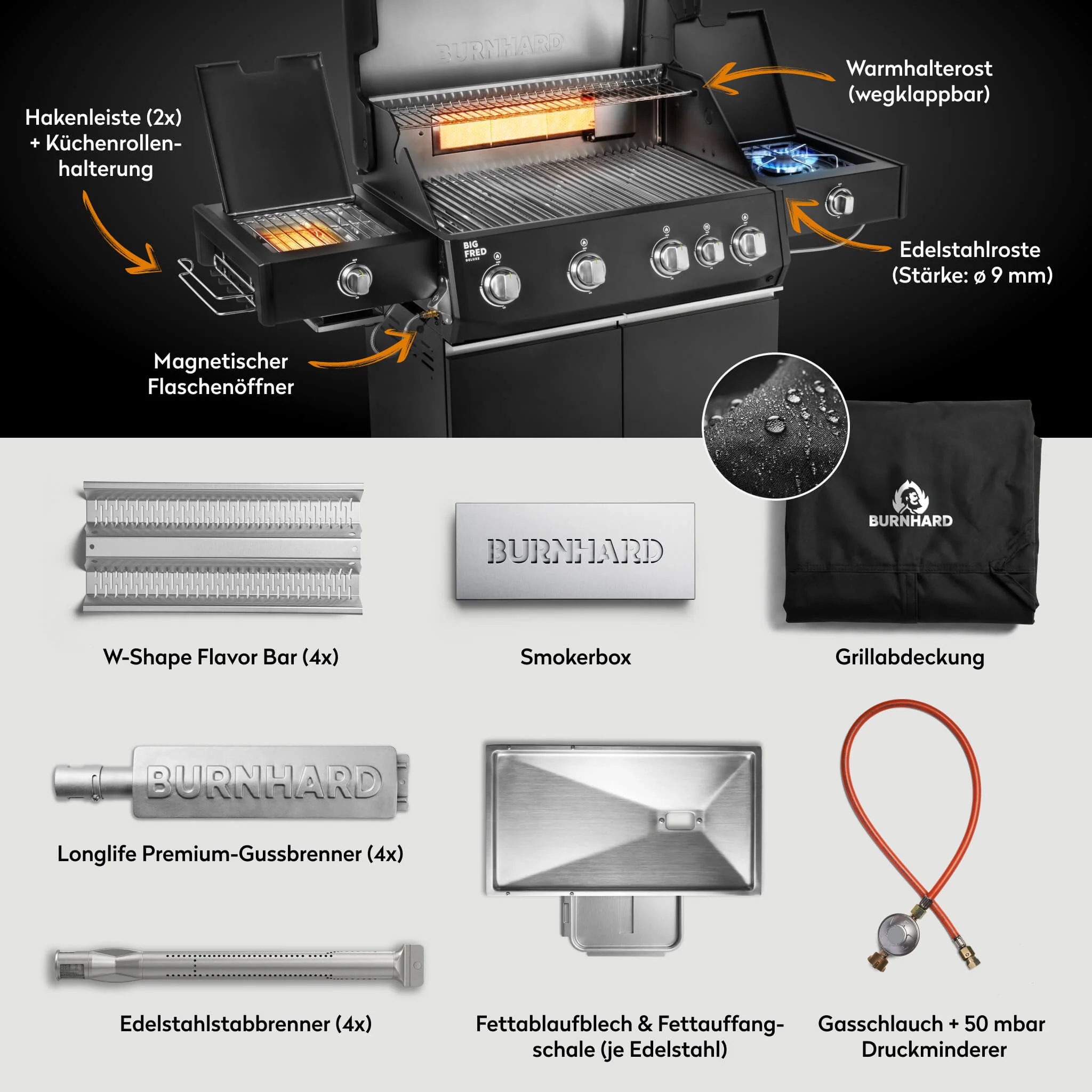 Der BURNHARD Big FRED Deluxe Plus Gasgrill 4 Brenner Series 4 Black Edition mit Edelstahl Grillrost ist ein High End Gasgrill für höchste Ansprüche. Maximale Leistung moderne Optik und pflegeleichte Ausstattung machen ihn zur perfekten Wahl für große Grillrunden und kompromissloses BBQ auf Profi Niveau.