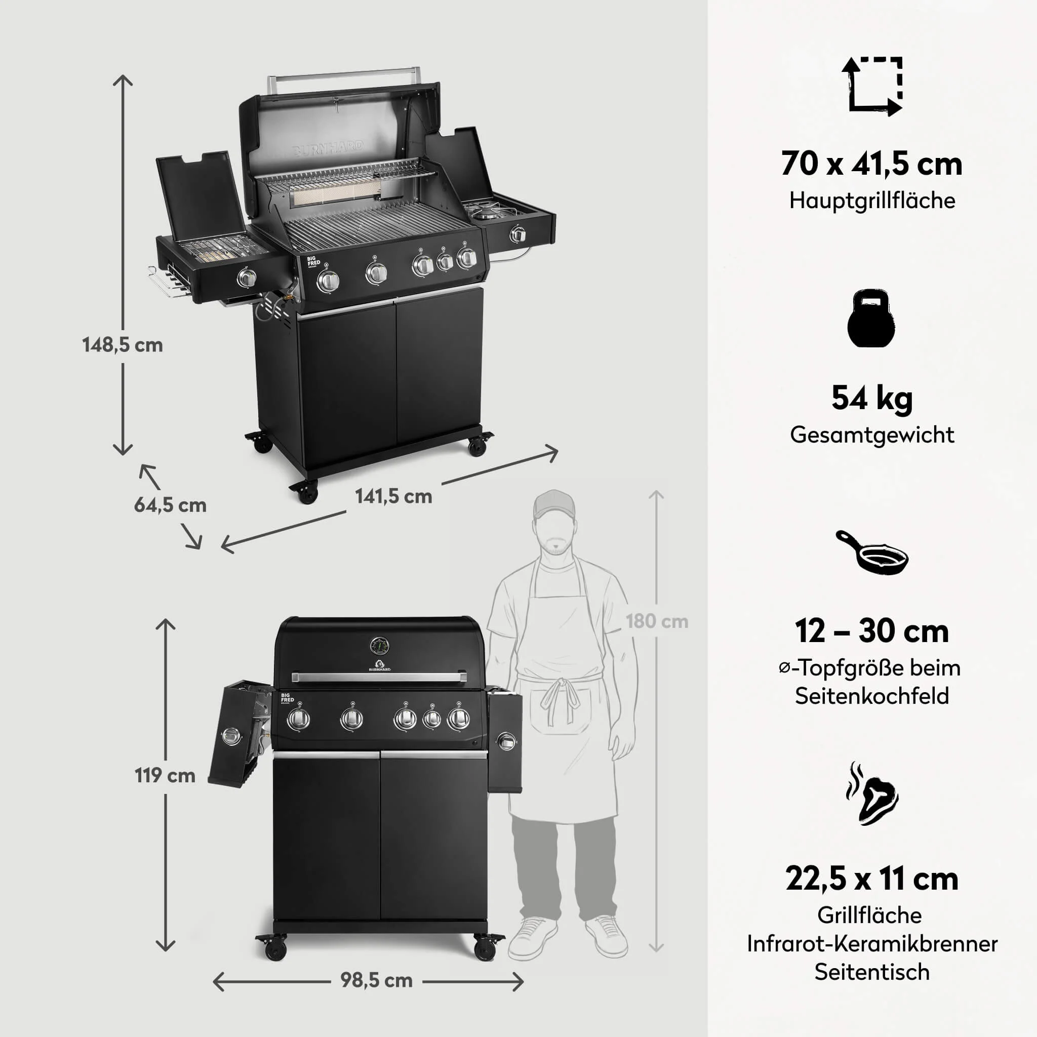 Der BURNHARD Big FRED Deluxe Plus Gasgrill 4 Brenner Series 4 in der Black Edition mit Edelstahl Grillrost ist die perfekte Wahl für alle die maximale Leistung mit maximaler Pflegeleichtigkeit verbinden wollen. Die robuste Pulverbeschichtung sorgt für ein modernes Design während die Edelstahl Grillroste besonders hygienisch und langlebig sind. Entwickelt für große Grillrunden und kompromissloses BBQ auf höchstem Niveau.