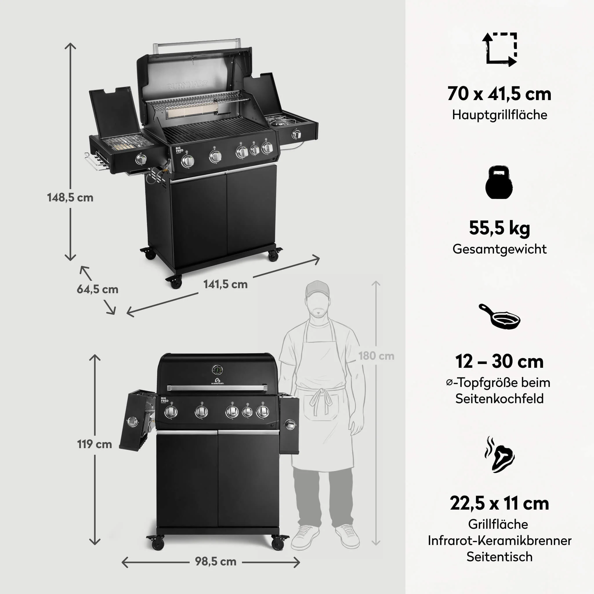 Der Seitentisch Infrarot Keramikbrenner sorgt für extreme Temperaturen und perfekte Krusten während der Heckbrenner ideal für Rotisserie und gleichmäßige Hitzeverteilung im Garraum ist. So gelingen dir Steaks mit intensiven Röstaromen genauso wie saftige Braten und knusprige Grillhähnchen.