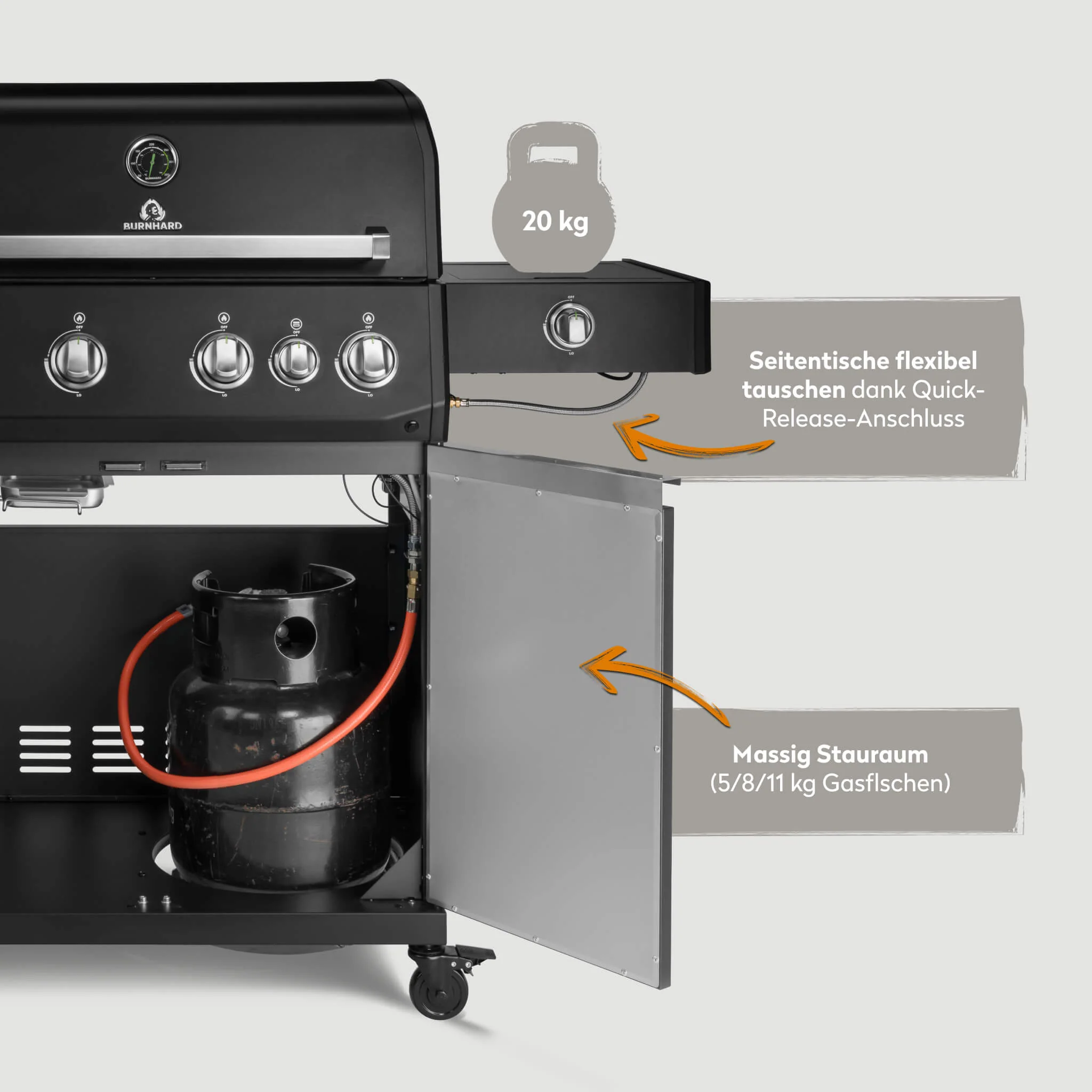 Der BURNHARD Big FRED Deluxe Plus Gasgrill 4 Brenner Series 4 in der Black Edition mit Gusseisen Grillrost ist die absolute Spitzenklasse für ambitionierte Grillfans. Mit einer extrem starken Gesamtleistung von 24,7 kW, mehreren Hochleistungsbrennern und umfangreicher Premium Ausstattung wird dieser Grill zur vollwertigen Outdoor Küche. Perfekt für große BBQ Sessions und höchste Ansprüche.