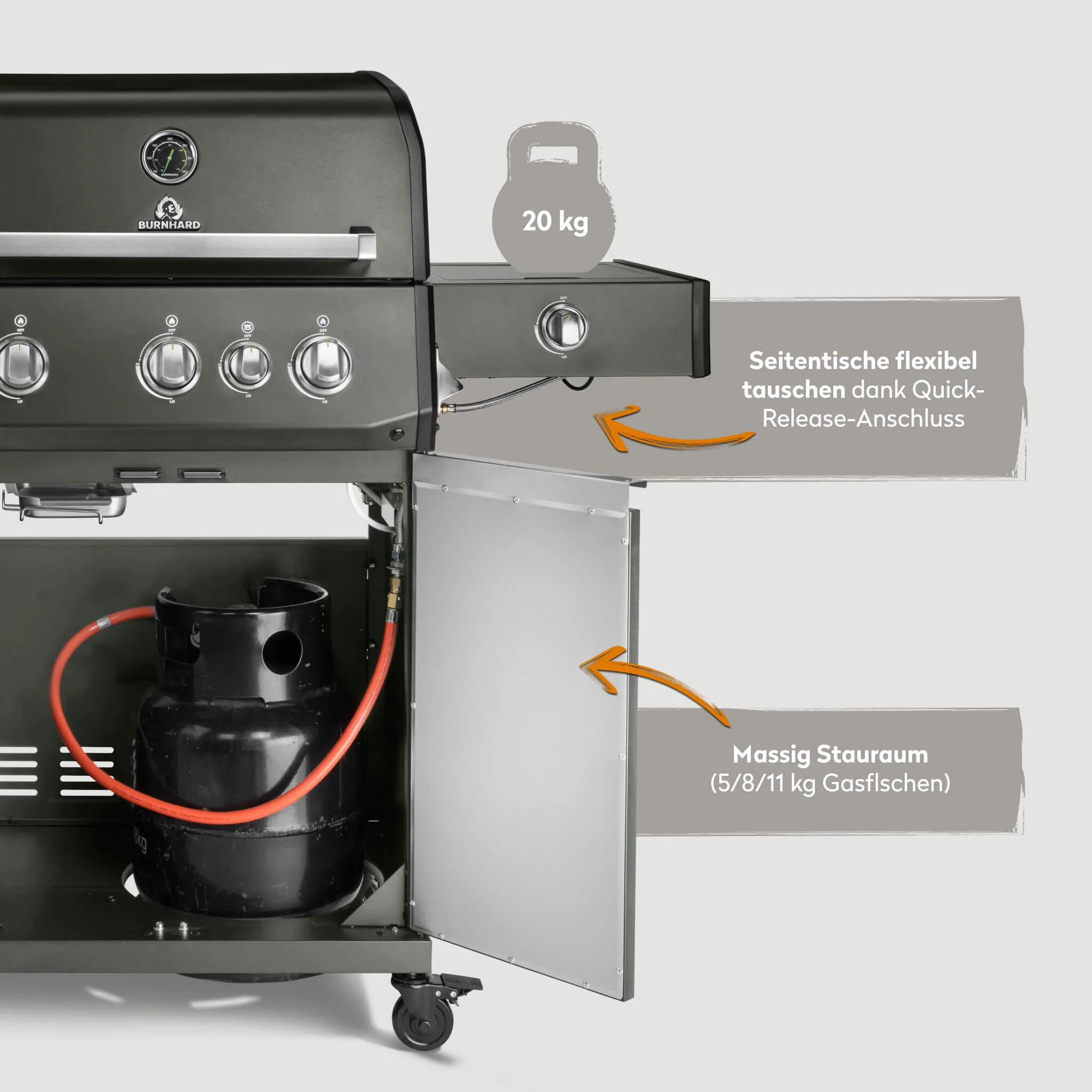 Der BURNHARD FRED Deluxe Gasgrill 3 Brenner Series 4 Green Edition mit Gusseisenrost ist die perfekte Kombination aus starker Leistung moderner Optik und langlebiger Bauweise. Ideal für alle die einen leistungsstarken und gleichzeitig besonderen Gasgrill suchen.