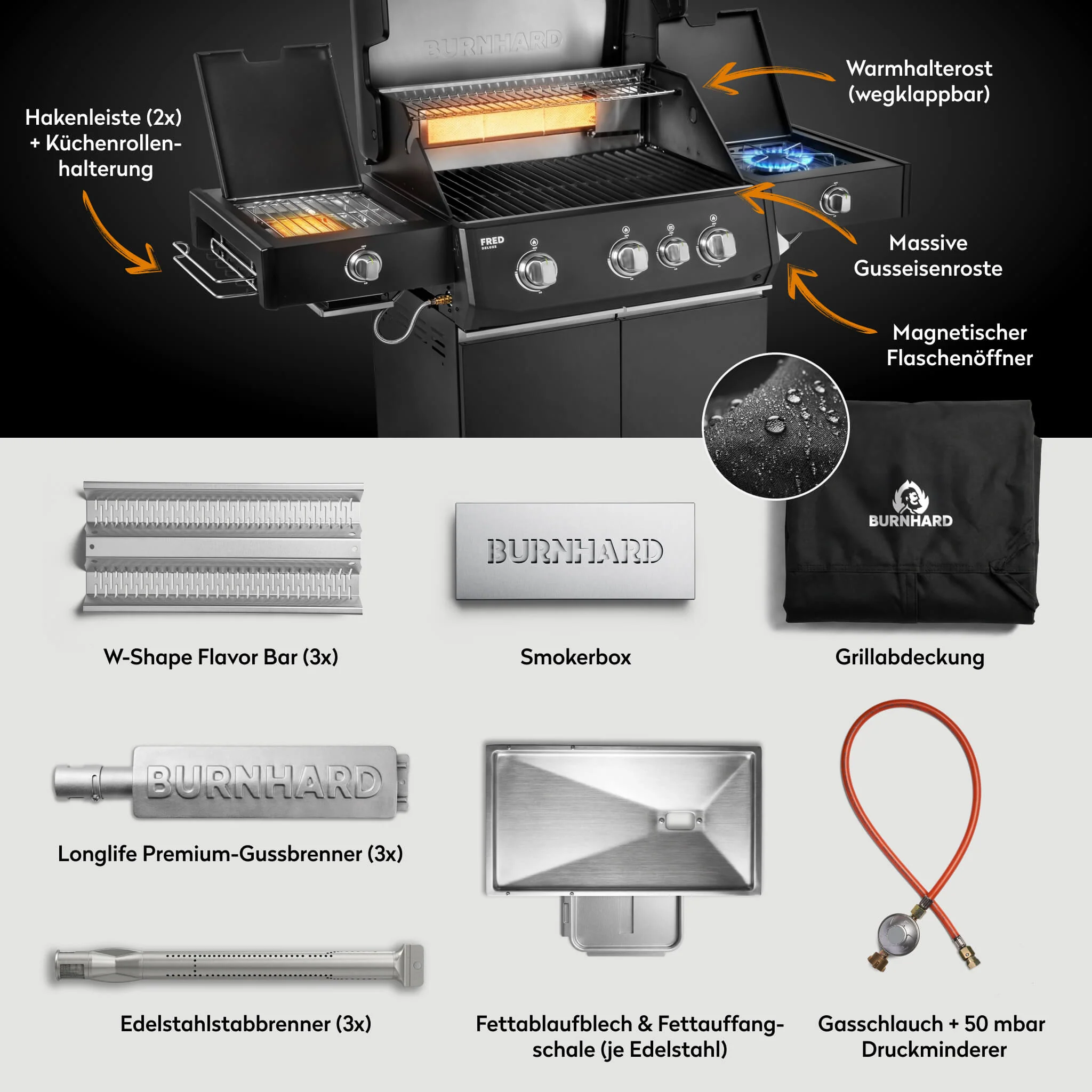 Der BURNHARD FRED Deluxe Plus Gasgrill 3 Brenner Series 4 Black Edition ist ein High End Gasgrill für höchste Ansprüche. Extreme Leistung vielseitige Brennerzonen und umfangreiche Ausstattung machen ihn zur perfekten Wahl für alle die kompromissloses BBQ auf Profi Niveau wollen.
