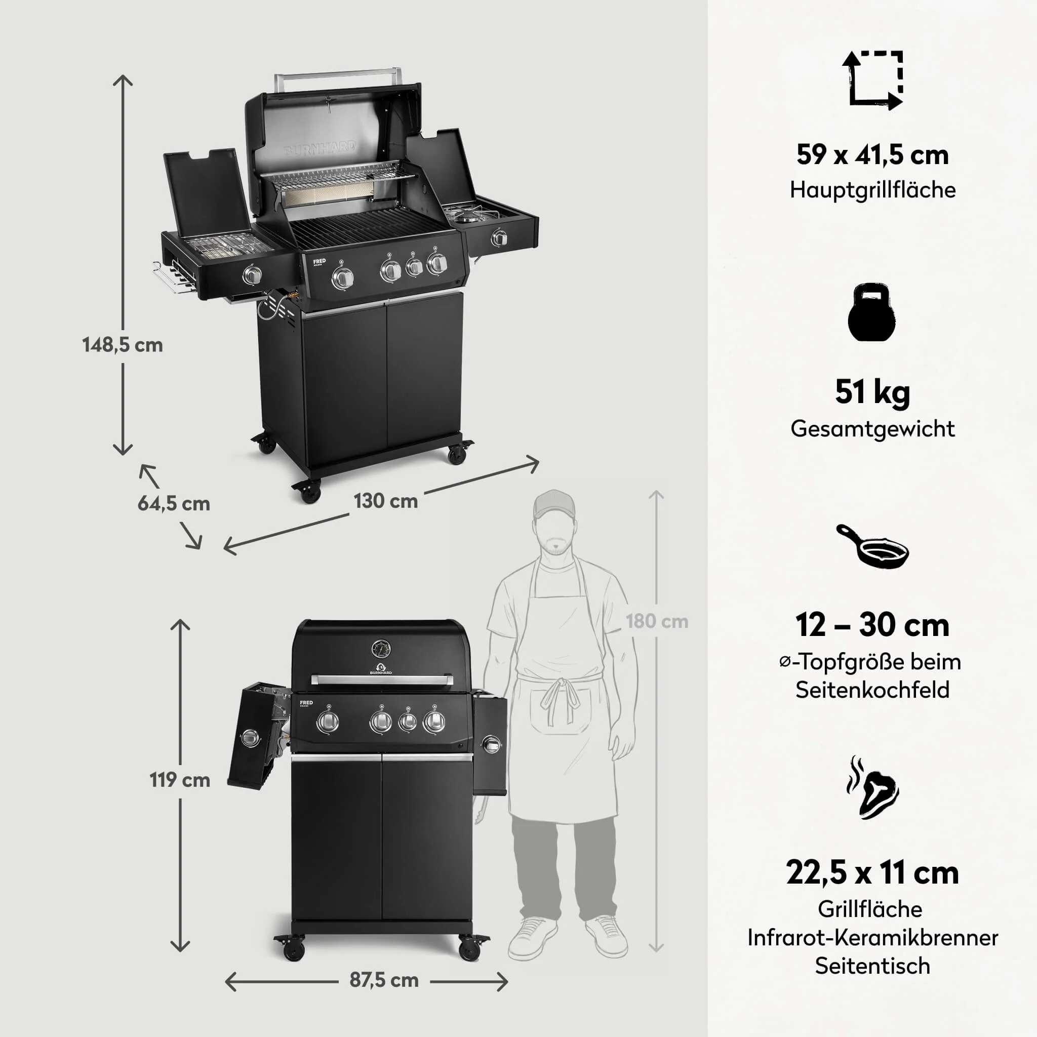 Produktinformationen "BURNHARD FRED Deluxe Plus Gasgrill 3 Brenner Series 4 Black Edition Maximale BBQ Power 20,95 kW Premium Ausstattung"