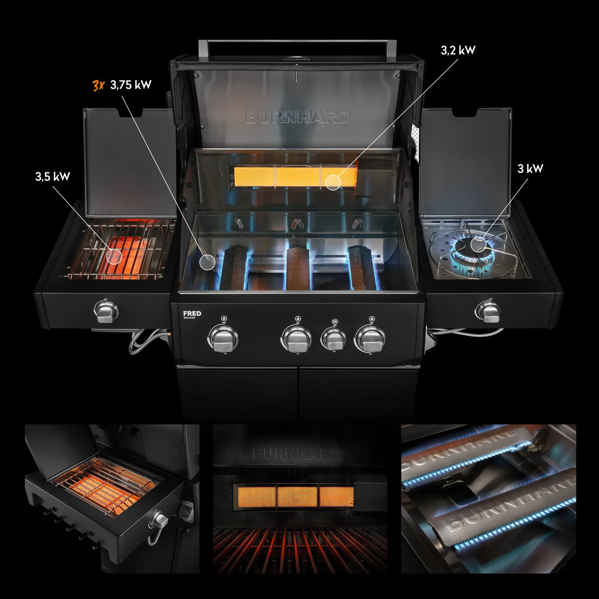 Produktinformationen "BURNHARD FRED Deluxe Plus Gasgrill 3 Brenner Series 4 Black Edition mit Edelstahl Grillrost Maximale BBQ Power 20,95 kW Premium Ausstattung"