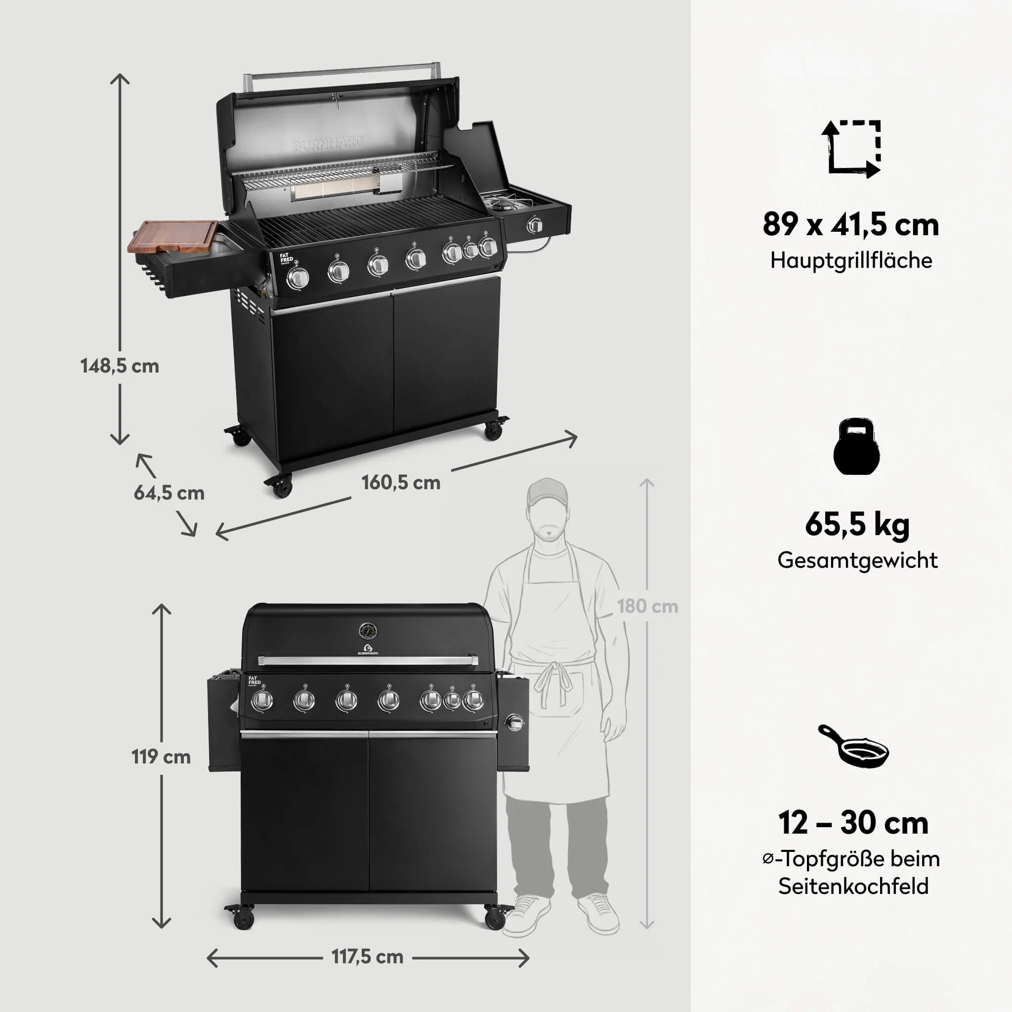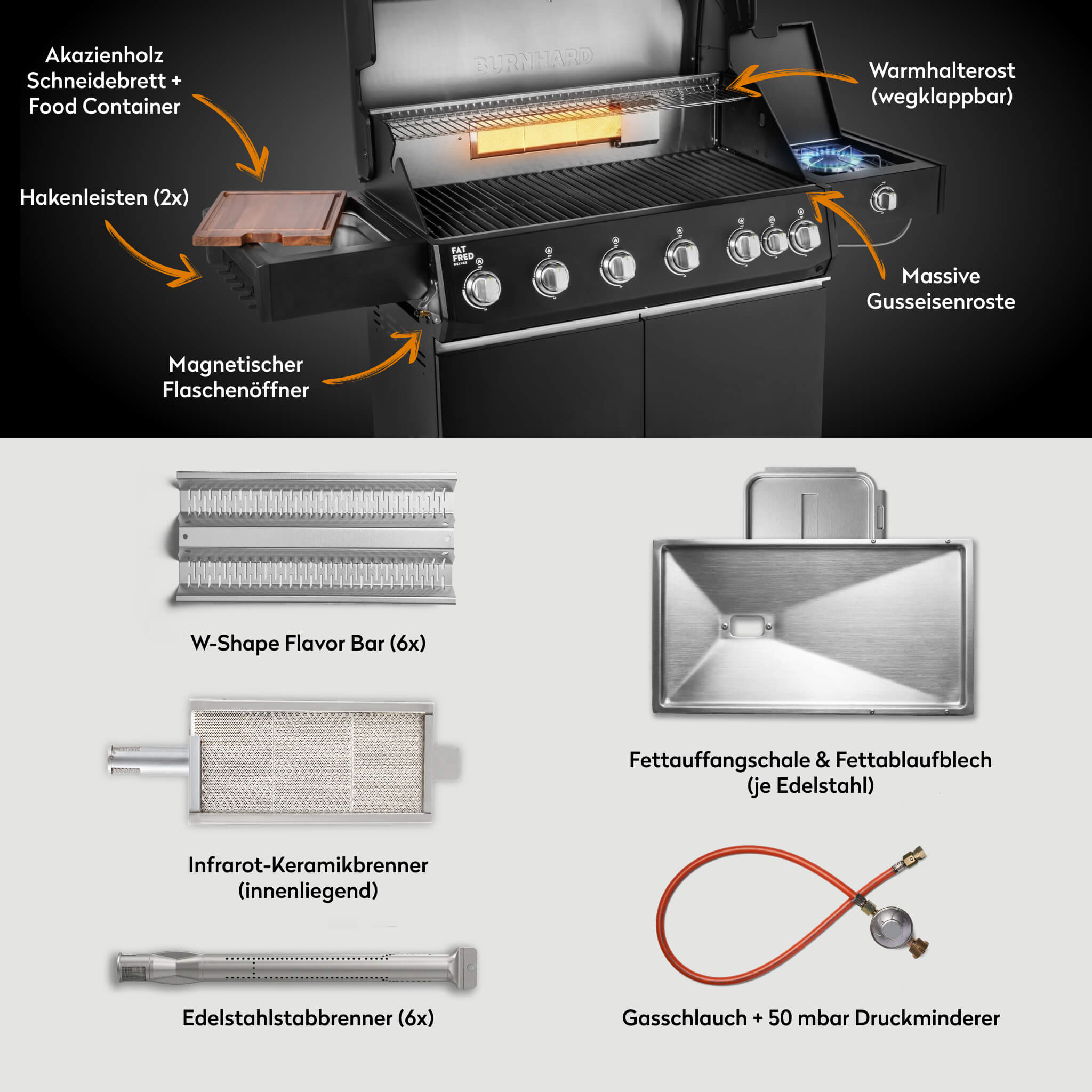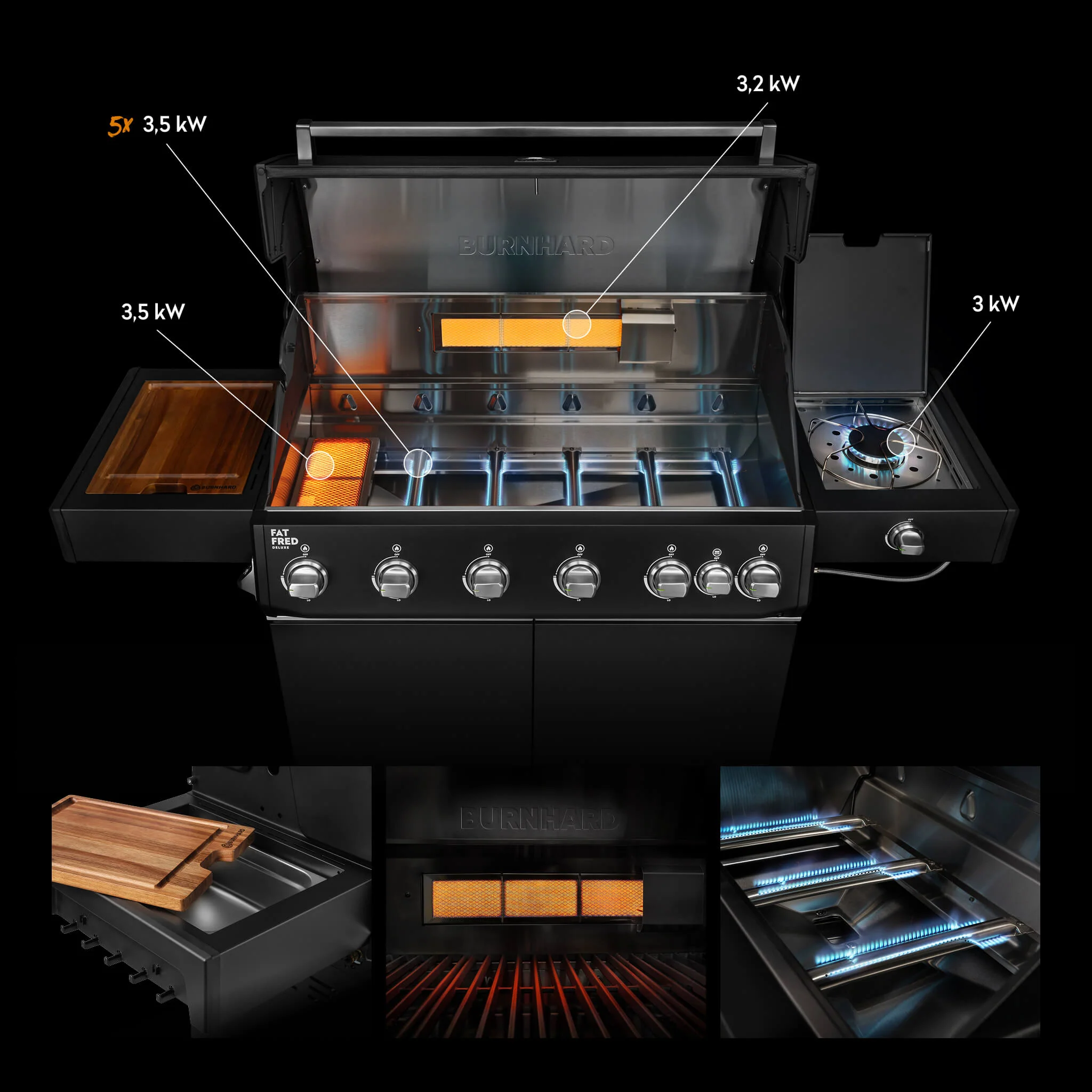 BURNHARD Fat FRED Deluxe Gasgrill 6 Brenner Series 4 Black Edition mit Gusseisen Grillrost Maximale BBQ Power 27,2 kW XXL Grillfläche