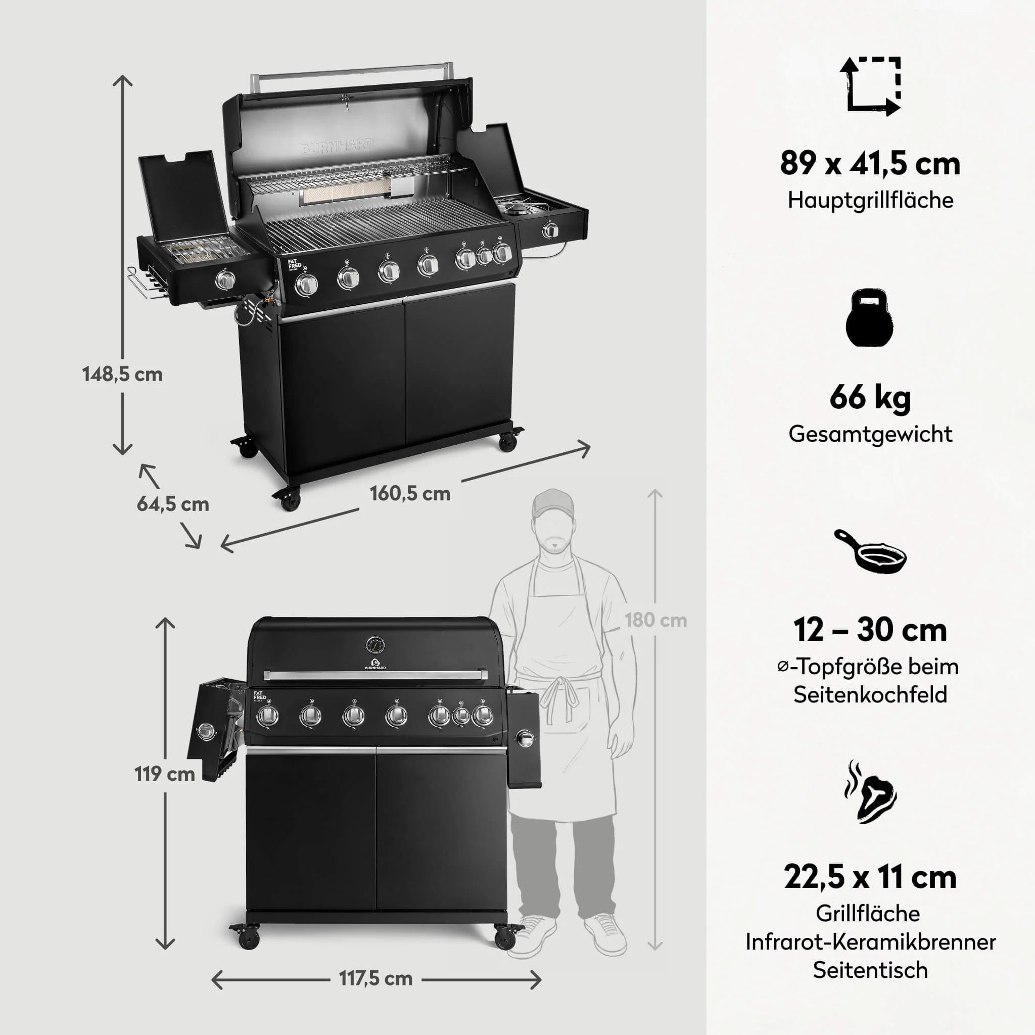 Der BURNHARD Fat FRED Deluxe Plus Gasgrill 6 Brenner Series 4 in der Black Edition mit Edelstahl Grillrost ist die absolute Oberklasse für alle die maximale Leistung mit maximaler Pflegeleichtigkeit verbinden wollen. Mit einer extrem starken Gesamtleistung von 30,7 kW, sechs Hochleistungsbrennern und hochwertiger Ausstattung wird dieser Grill zur vollwertigen Outdoor Küche für große BBQ Events und höchste Ansprüche.