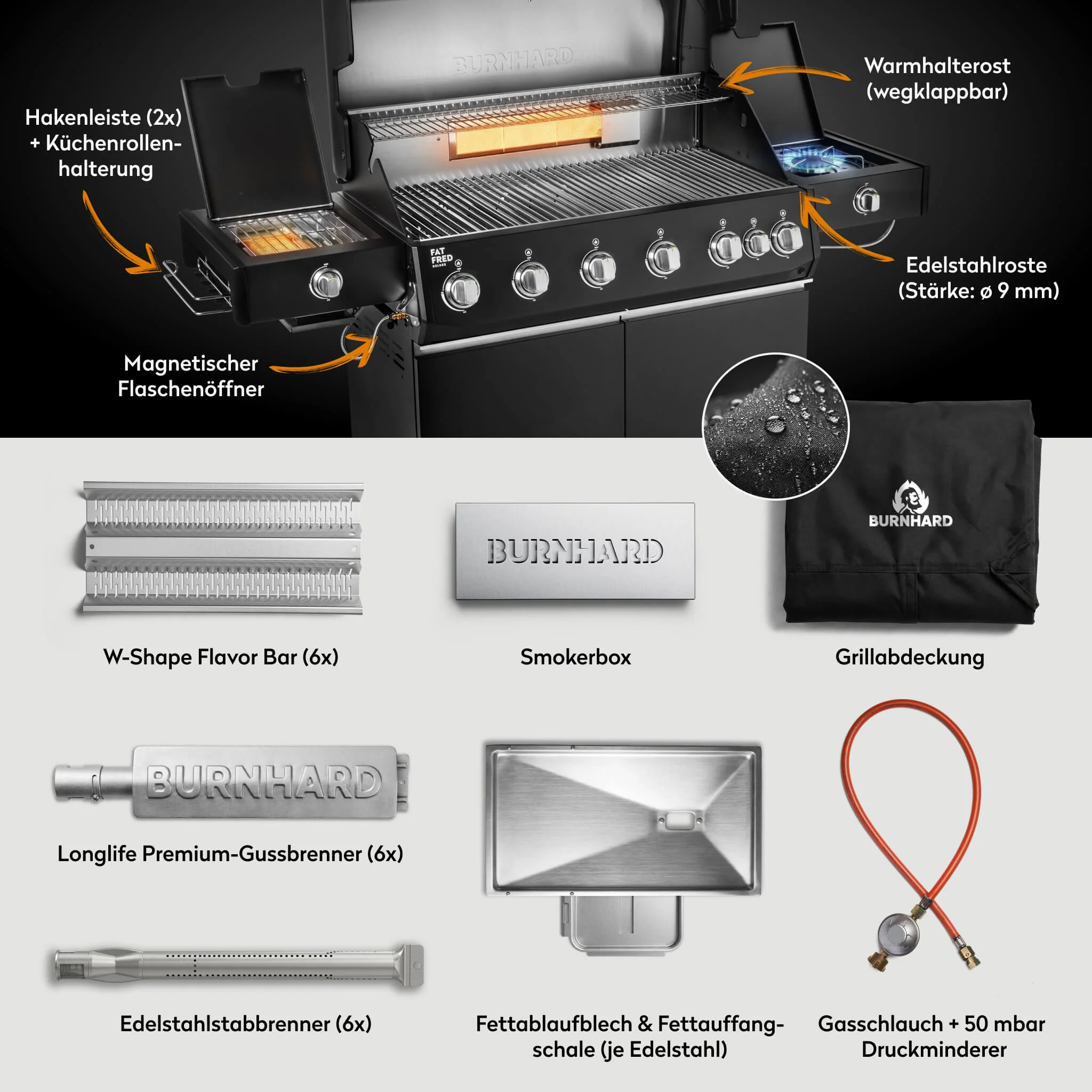 Produktinformationen "BURNHARD Fat FRED Deluxe Plus Gasgrill 6 Brenner Series 4 Black Edition mit Edelstahl Grillrost Maximale BBQ Power 30,7 kW XXL Premium Ausstattung"