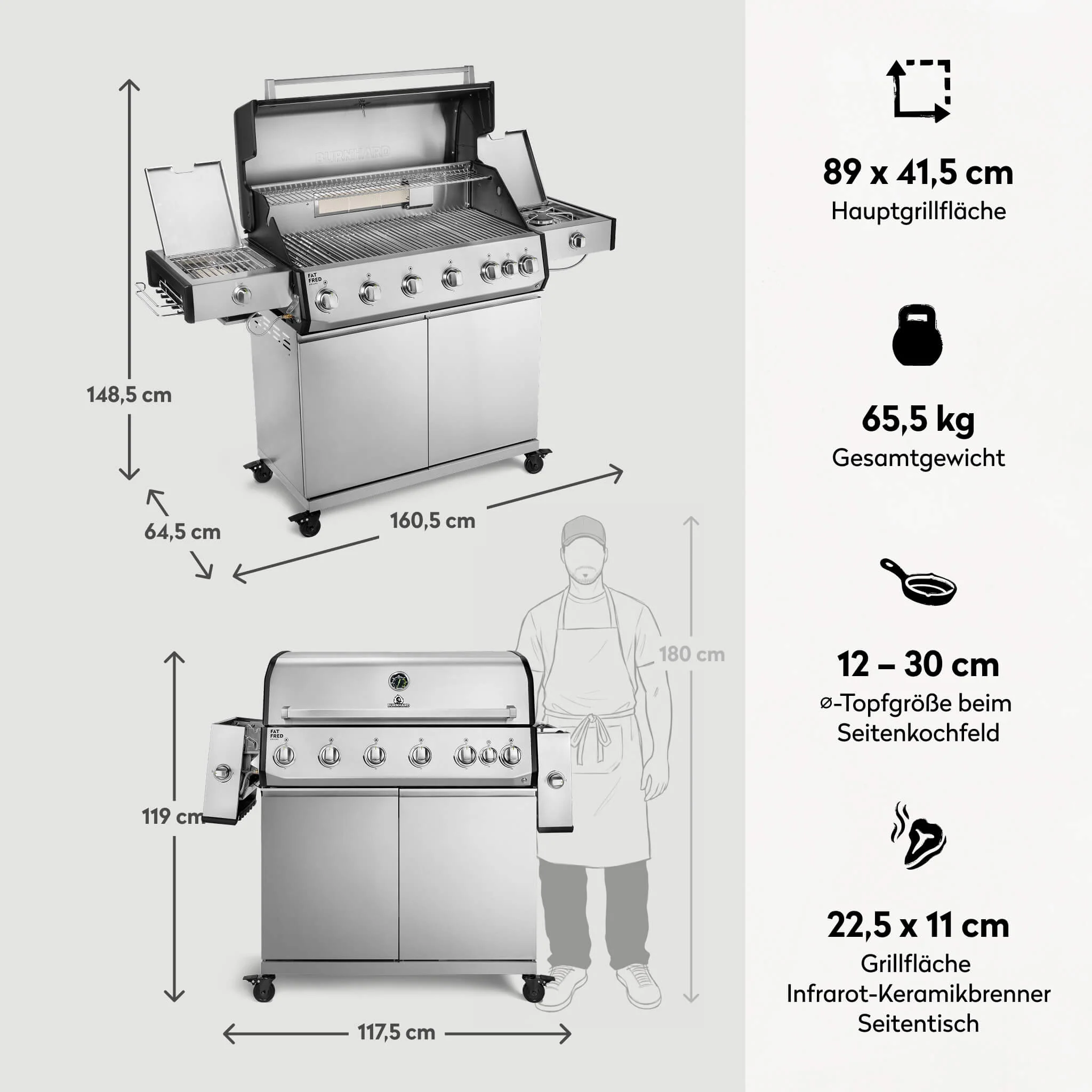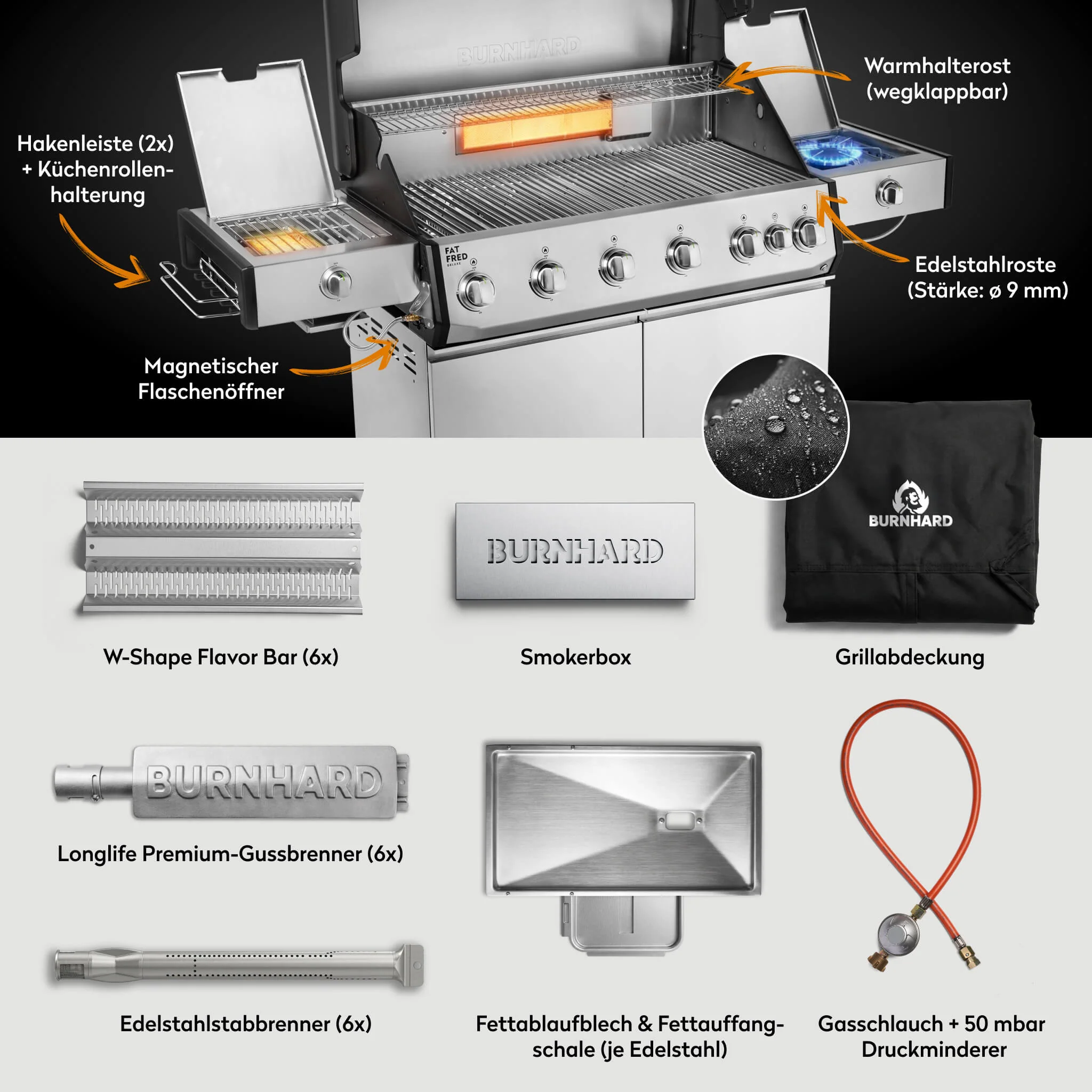 Produktinformationen "BURNHARD Fat FRED Deluxe Plus Gasgrill 6 Brenner Series 4 Edelstahl Grill mit Edelstahl Grillrost Maximale BBQ Power 30,7 kW XXL Premium Ausstattung"