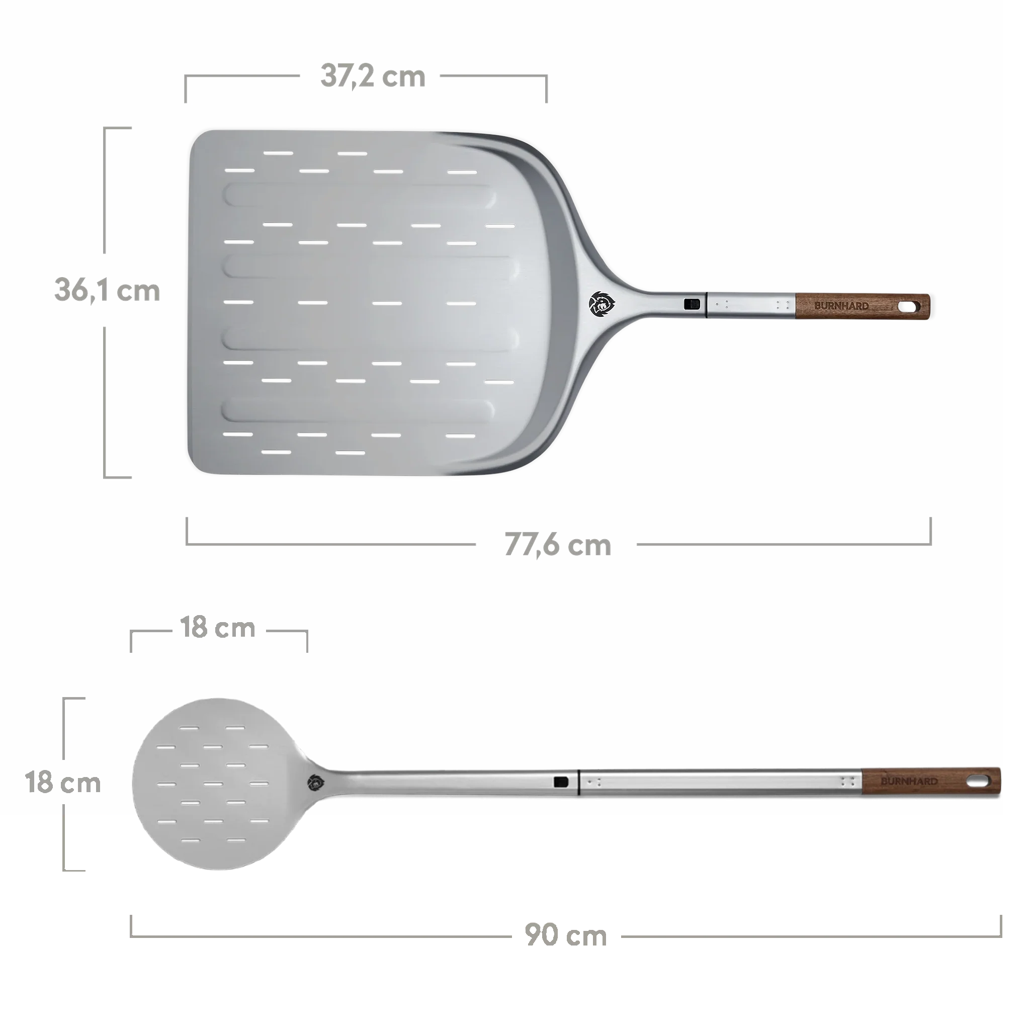 Der perforierte Schieber aus eloxiertem Aluminium ermöglicht sanftes Handling durch Dampfentweichung und Mehlablage. Der flexible Wender erleichtert das Rotieren der Pizza. Der Teigspachtel bietet ergonomisches Formen, und das Akazienbrett eignet sich ideal zum Servieren. Alle Teile sind robust und funktional.