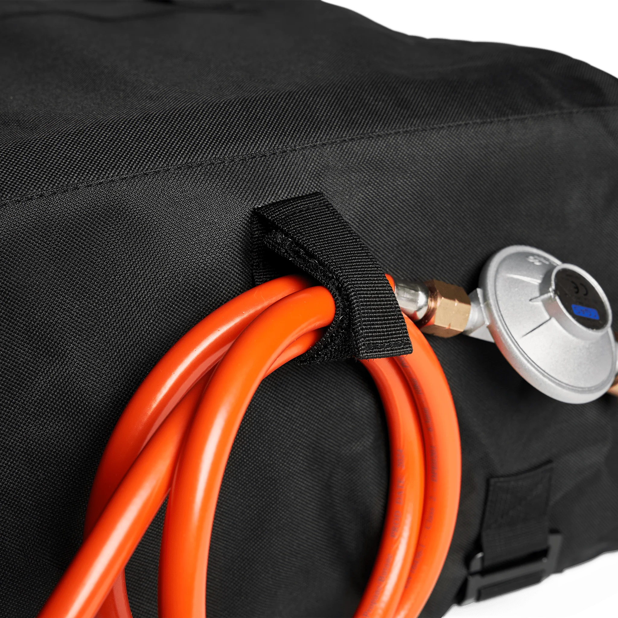 Die integrierte Fixierung für den Gasschlauch verhindert Beschädigungen beim Transport. Mit dem praktischen Kordelzug kannst du die Tasche fest verschließen und optimal anpassen.