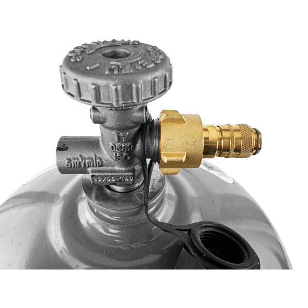 Die Kupplung wird direkt auf das genormte Propanflaschengewinde 21,8 x 1 1/4" links montiert und passt damit auf gängige 5 kg und 11 kg Propanflaschen.